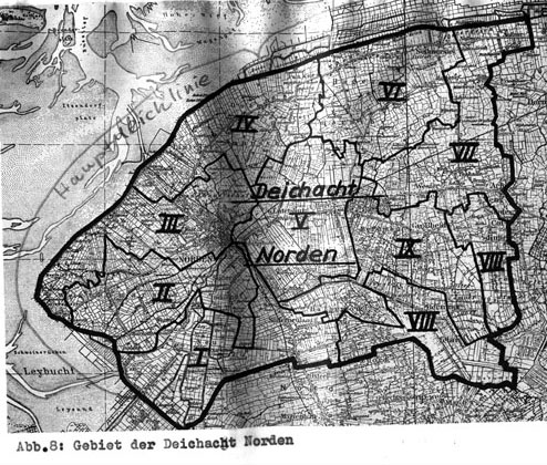Die Karte „ Ostfriesland vor Beginn des Deichbaues - etwa um 800 n. Chr.“, zeigt den wahrscheinlichen Küstenverlauf um diese Zeit. Nördlich der Ems der Emsgau mit der Sielmönker Bucht, um den Einbruch der Ley herum der Federgau, mit dessem nördlichen Teil der heutige Bereich der Norder Deichacht beginnt.