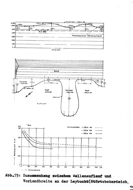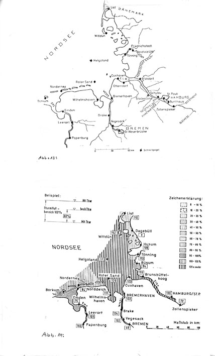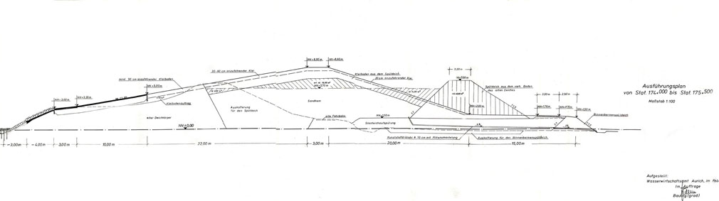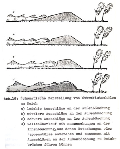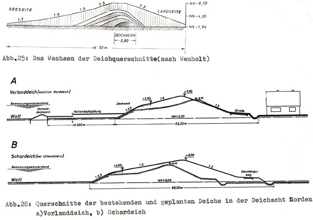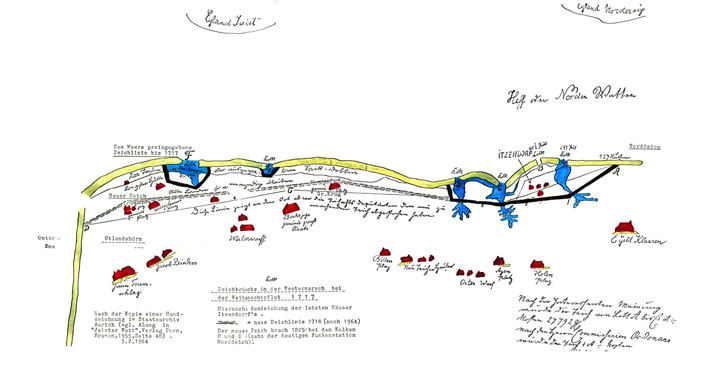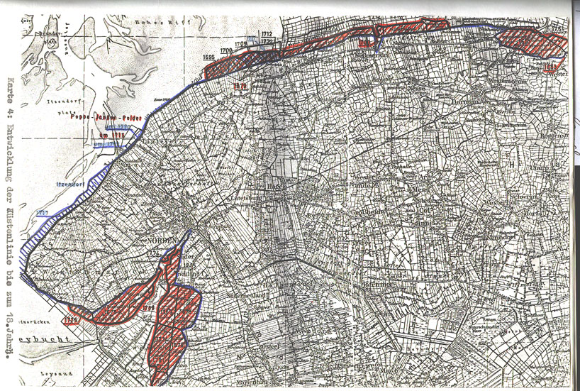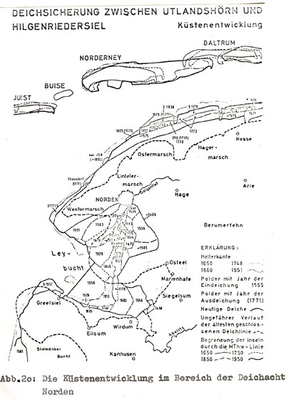 „An der Nordküste des Norderlandes waren die Auswirkungen der Fluten, abgesehen von den Verlusten durch die Überschwemmung relativ günstig. Nur auf einer kurzen Strecke in Ostermarsch wurde der Deich über Kloster und Wilhelmsfeld als Halbmond eingelegt, im übrigem von Itzendorf bis Theener dagegen um durchschnittlich 500 bis 600m auf den Anwachs vorverlegt. Die restlichen Deiche des Norderlands zwischen Utlandshörn und Dornum dürften im alten Zuge wieder hergerichtet worden sein“ 1) Ohling, S.37