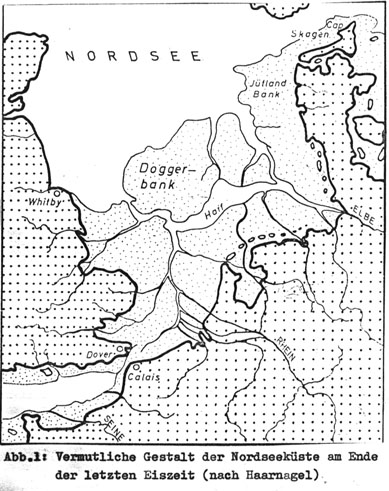 „So befand sich während der Weichselvereisung das Meeresniveau etwa 100 m tiefer als heute, die Küste erstreckte sich rund 300 km weiter seewärts und lag am Nordrand der Dogger.- und Jütlandbank.“ (Rack, S. 23)